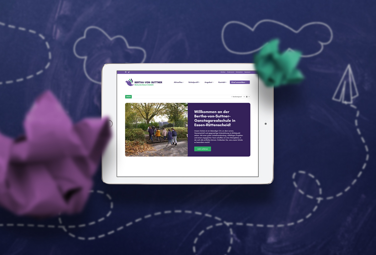 Im Zuge der Einführung des neuen Logos wurde auch die Website der Bertha-von-Suttner-Realschule vollständig neu gestaltet. Unsere neue Internetpräsenz greift dieselbe Farbwelt wie das Logo auf und verbindet damit visuelle Identität mit moderner Technik. Durch eine klare Struktur und verbesserte Übersicht finden Besucherinnen und Besucher schneller die Informationen, die sie benötigen.